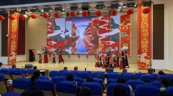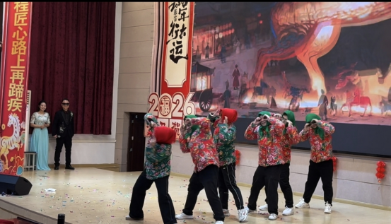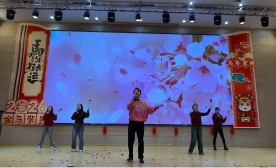精彩纷呈的文艺节目轮番登场。各部门精心选送的节目形式多样、创意纷呈,现场掌声与欢呼声此起彼伏。制造部带来的歌舞《新年快乐》活力四射,瞬间点燃全场氛围;交建部小合唱《桃花朵朵开》旋律轻快,传递出盎然春意;学招培组情景剧《甄嬛传—期末的爱与恨》以幽默诙谐的方式演绎教育工作者的日常,引发全场教职工强烈共鸣;电信部歌舞《荷·炫风》歌声余韵悠长,舞蹈欢快逗趣;医卫部串烧《奔跑吧,医卫2.0》动感十足,展现出青年教职工的蓬勃朝气;教总组茶艺表演《茉莉芬芳》宁静典雅,尽显中华优秀传统文化魅力;党政工财组男生二重唱《红旗飘飘》深情满怀,抒发了全体教职工的爱国赤诚与教育情怀;经贸部歌舞串烧《再见》融合经典旋律与动感街舞,碰撞出别样精彩;校教工团支部国风秀衣袂飘飘、古韵盎然,尽显华服之美。联欢会的压轴节目由学校领导班子全体成员及全体中层干部共同演绎大合唱《奉献》,歌声铿锵有力,唱响了甘于奉献、勇于担当的时代主旋律,充分展现出学校管理团队团结一心、率先垂范的精神风采。节目演出期间,还穿插了趣味游戏和幸运抽奖环节,趣味互动妙趣横生,惊喜抽奖激动人心,现场欢笑声、喝彩声接连不断,节日氛围浓厚热烈。