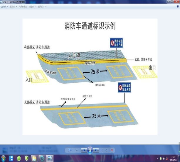 1. 在以上线路的消防车通道路测缘石立面和顶面画黄色禁止停车标线,没有缘石的路面划黄色禁停单实线,距路面边缘30厘米,线宽15厘米。